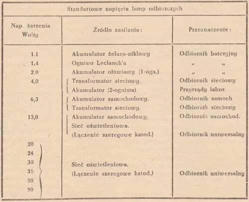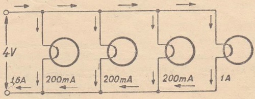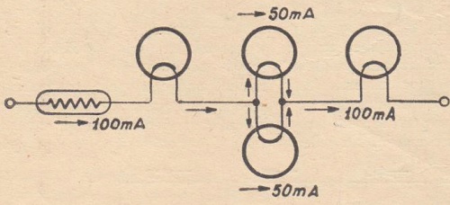 Można jednak w poszczególnych przypadkach zamiast np. jednej lampy o prądzie żarzenia 100 mA włączyć w obwód zasilania dwie równolegle połączone lampy 50 miliamperowe. Zasilanie szeregowo ze sobą połączonych lamp musi się odbywać przy nominalnym prądzie. Jeżeli suma napięć wszystkich szeregowo połączonych lamp jest mniejsza od napięcia źródła zasilającego, wówczas musimy szeregowo z lampami załączyć opór którym wyregulujemy prąd do nominalnej wartości. Zamiast oporu stałego odpowiedniej wartości stosuje się przeważnie opór żelazo-wodorowy zwany "Urdoxem" działający automatycznie to znaczy nastawiający niezależnie od wielkości napięcia zasilającego prąd żarzenia na odpowiednią wartość nominalną.