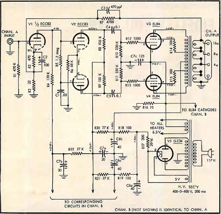 Prosty i łatwy w budowie wzmacniacz stereofoniczny o mocy wystarczającej do wszystkich, za wyjątkiem najbardziej rozbudowanych, systemów stereo, w którym dwie pary EL84 dostarczają 15W niezniekształconej mocy w każdym kanale.