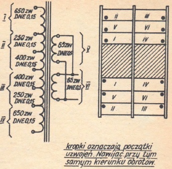 Transformator sieciowy można nawinąć samodzielnie, jeżeli dysponujemy rdzeniem o przekroju około 20 cm2. Uzwojenie pierwotne ma 526 zwojów nawiniętych przewodem DNE Ø 0,5 mm, uzwojenie wtórne - 710 zwojów nawiniętych przewodem DNE Ø 0,3 mm. Uzwojenie żarzenia lamp ECC83 powinno posiadać 15 zwojów DNE Ø 0,8 mm, a uzwojenie żarzenia lamp EL84 16 zwojów DNE Ø 1,2 mm.