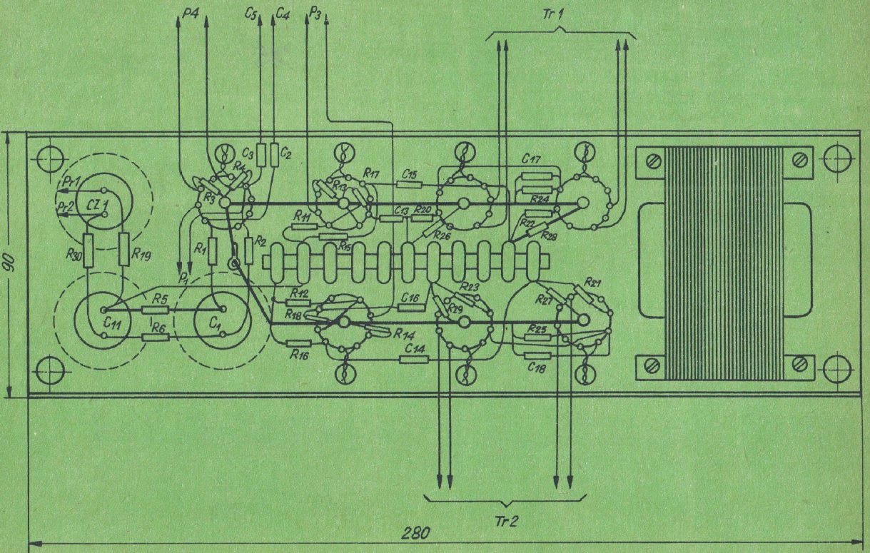 Schemat montażowy układu elektrycznego pokazany jest na rys. 4. Podczas montażu należy przestrzegać zasad obowiązujących przy budowie tego typu konstrukcji: połączenia siatek lamp wykonać przewodem w ekranie, szynę uziemiającą, łączącą podstawki lamp, wykonać z drutu o średnicy co najmniej 2 mm i połączyć z chassis tylko w jednym punkcie, przewody łączące obwody żarzenia prowadzić po drugiej stronie chassis.
