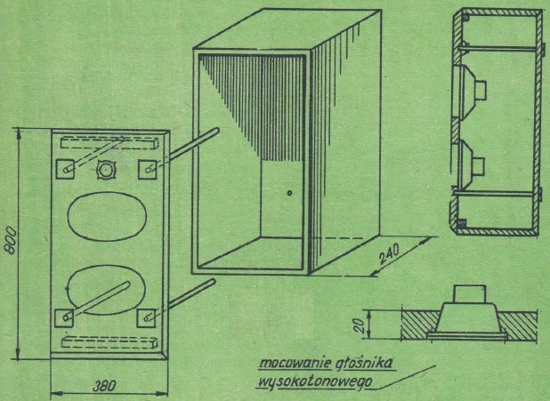 Kolumny głośnikowe (rys. 5) wykonane są ze sklejki grubości 15 mm jako obudowy zamknięte. Na przedniej ścianie kolumn znajdują się głośniki.