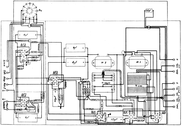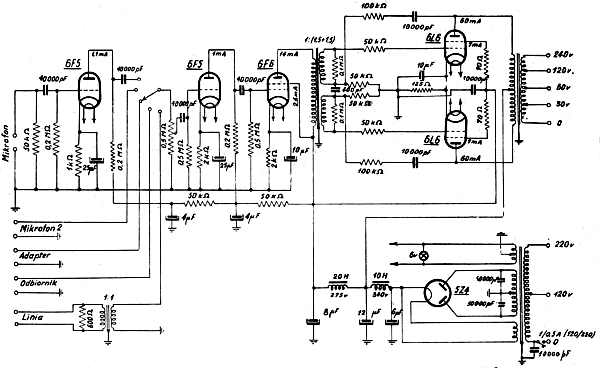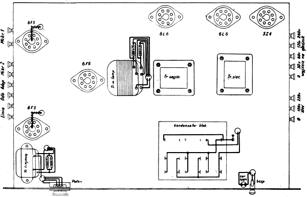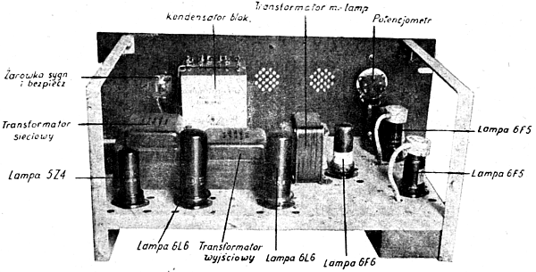 Wzmacniacz nasz składa się ogółem z 5 lamp wzmacniających i 1-ej prostowniczej. Pierwsze trzy lampy pracują w układzie oporowo - pojemnościowym niskiej częstotliwości, prze czym pierwsza z nich służy do wzmocnienia przekazywanych sygnałów z mikrofonu pojemnościowego lub z innego, zainstalowanego daleko od wzmacniacza, wskutek czego następuje osłabienie sygnału. Po wzmocnieniu w pierwszym członie na anodzie lampy 6F5, kierowany on jest dalej na dwustopniowy wzmacniacz oporowo - pojemnościowy niskiej częstotliwości, pracujący na lampach 6F5 i 6F6, a potem na wzmacniacz mocy w układzie "push - pull" (przeciwsobnym) w klasie AB1. Sprzężenie wzmacniacza mocy z ostatnim członem niskiej częstotliwości jest transformatorowe. Wzmacniacz mocy pracuje na dwóch lampach 6L6. Wyjście jest również transformatorowe i dostosowane dla różnych napięć, czyli dla różnych typów głośników i różnych warunków pracy. Jeżeli głośniki pracują równolegle to należy łączyć je tak, aby odpowiednie zaciski głośników były połączone z odpowiednimi zaciskami transformatora wyjściowego, czyli aby zachować dopasowanie ich do pracy wzmacniacza. Każdy głośnik o większej mocy posiada transformator, na którym są końcówki do odpowiedniego podłączenia.
