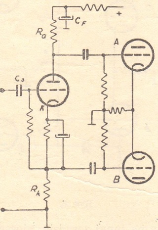 Anoda lampy a do starcza do push-pull'a normalnego napięcia wzmocnionego i o odwróconej fazie, jej zaś katoda, w której widzimy duży opór rK nie dostarcza napięcia wprost na push-pull, lecz napędza drugą lampę pośrednią b o "wejściu na katodę", czyli z "uziemioną siatką".