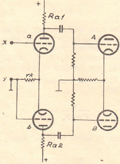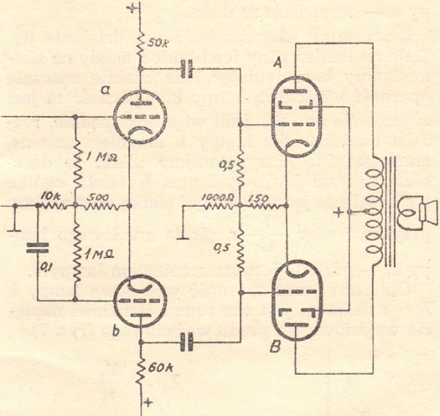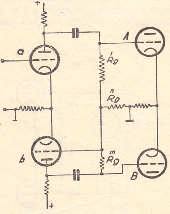 Na rys. 2 widzimy najprostszy układ odwracacza fazy. Lampę końcową A napędza lampa a, zaś lampę końcową B jej lampa wzbudzająca b. Ponieważ napięcie siatki lampy b jest wzięte z napięcia anodowego lampy a, jest jasne, że napięcie oddawane z lampy b jest o 1800 przesunięte w stosunku do a, co jest pierwszym warunkiem dla lampowego układu wejściowego dla push-pull'a. Drugim warunkiem jest równość napięć anodowych lamp a i b. W tym celu należy, aby lampa b miała miała wzmocnienie równe jedności. Osiągamy to łatwo przez napędzanie jej z dzielnika napięć pobierając 1/G napięcia anodowego lampy a, gdzie jako G oznaczamy wzmocnienie zarówno lampy a, jak i lampy b. Stąd: