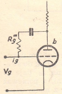 Zaletą katodyny jest to, że układ ten pracuje prawie bez zniekształceń, ponieważ posiada z natury swojej bardzo silne ujemne sprzężenie zwrotne, tak sile przecież, że wzmocnienie spada poniżej jedności. Drugą jej zaletą, choć mniejszego znaczenia, jest znaczny wzrost oporności wejściowej lampy. Wynika to z prostego faktu, że oporność wejściowa jest to stosunek napięcia wejściowego do prądu wejściowego. Obliczmy ten prąd wejściowy i, będzie on równy prądowi w oporze wpływowym siatki rg (rys. 3).