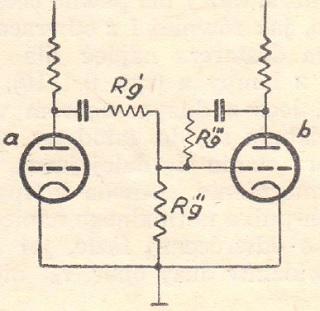 Rozpatrzmy więc układ z rys. 6. Lampa a pracuje zupełnie normalnie i zasila wprost swoją lampę końcową A, wykorzystując swe pełne wzmocnienie (może być pentodą rodzaju AF7, 6J7 itp.). Lampa b otrzymuje swe napięcie siatkowe z dzielnika napięć, złożonego z dwu jednakowych oporów R'g i R''g. Gdyby nie było oporu R''g (równego poprzednim), pomiędzy anodą, a siatką lampy b, to otrzymywałaby ona na swą siatkę połowę napięcia anodowego lampy a - oczywiście za dużo.