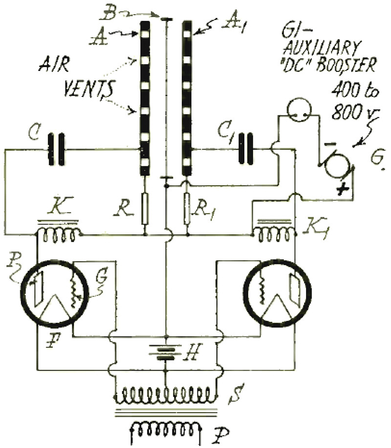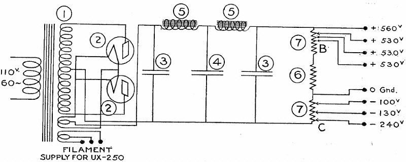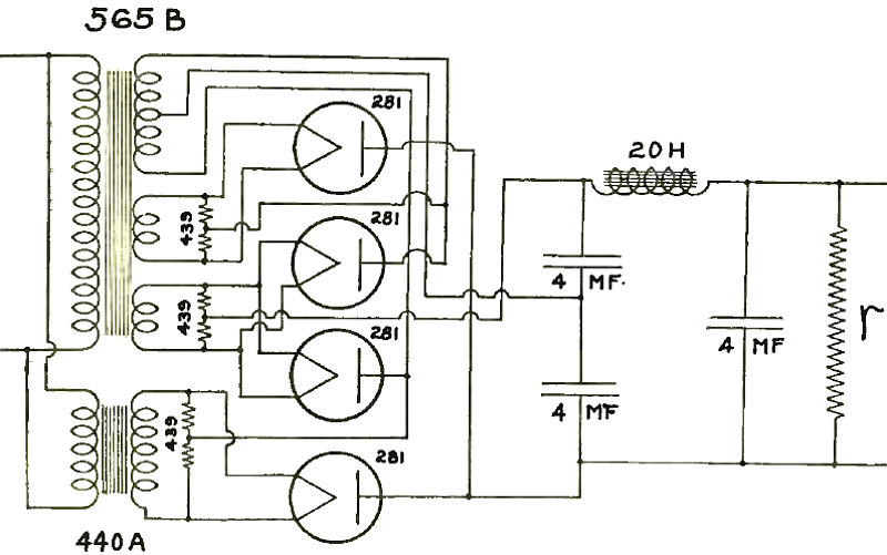 "Przedstawiony układ jest rekomendowany przez General Radio Co. do zasilania amatorskich nadajników i wzmacniaczy mocy wymagających napięć zasilających od 1000V do 1500V przy prądach do 170mA. Zasilacz wykorzystuje cztery lampy prostownicze typ 281. Każda z lamp prostowniczych samodzielnie przystosowana jest do prądów 85mA i napięć 700V..."
