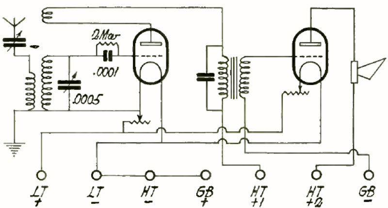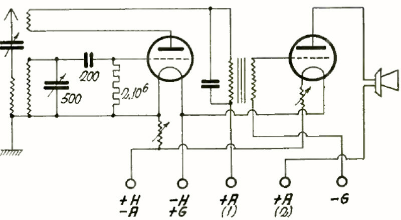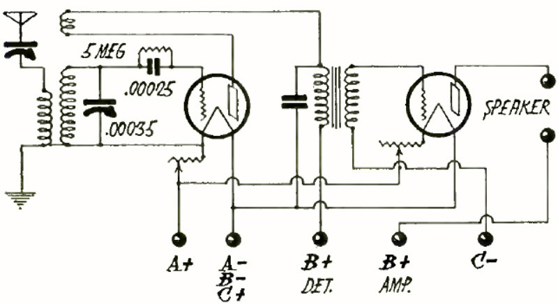 Schemat ideowy 3-lampowego odbiornika radiowego.