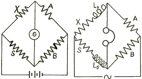 Schematy ideowe mostków pomiarowych. Z lewej prosty mostek rezystancyjny, z prawej indukcyjny.