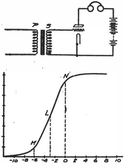 Rys. 4 przedstawia krzywą uzyskaną z niektórych typów lamp wzmacniacza z pewnymi regulacjami żarnika i baterii B. Gdyby ta lampa została użyta z połączeniami pokazanymi na rys. 3, wzmocnione dźwięki byłyby zniekształcone, ponieważ dodatni potencjał rzędu dwóch woltów zwiększyłby prąd anodowy, ale bardzo nieznacznie, podczas gdy potencjał ujemny o tej samej wartości spowodowałby stosunkowo duży spadek. Aby wzmocnić bez zniekształceń, konieczne byłoby, aby wzrost w tym przypadku był równy zmniejszeniu. Można to osiągnąć, podłączając baterię o napięciu około trzech woltów między żarnikiem a uzwojeniem wtórnym transformatora, tak aby jego ujemny koniec był skierowany w stronę tego ostatniego. Spowodowałoby to przesunięcie prądu anody do punktu L na krzywej z rys. 4. Jeśli napięcie siatki waha się teraz o dwa lub trzy wolty w dowolnym kierunku, odpowiedni wzrost i spadek prądu anodowego będzie równy i nie wystąpią zniekształcenia. Taka bateria włączona w obwód siatki nazywana jest baterią „C” lub baterią „bias”. Ponieważ dostarcza mało prądu lub nie dostarcza go wcale, może składać się z najmniejszego rozmiaru baterii od latarki.