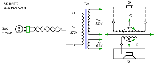 Rys.1. Schemat jednego z układów odsłuchowych przy ustalaniu wzajemnego ustawienia transformatora sieciowego i głośnikowego