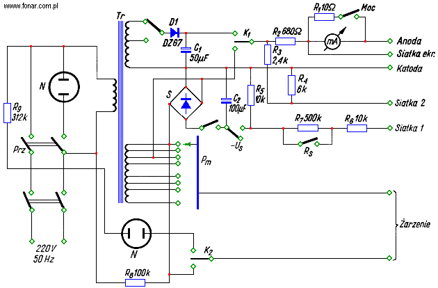 Przy badaniu opieramy się na wskazaniach prądu ściśle określonego dla danej lampy. Przy badaniu lamp mocy miernik należy zabocznikować opornikiem o wartości kilku omów. Do stwierdzenia wzmocnienia lampy służy wyłącznik Rs i Us, za pomocą którego włączamy ujemne napięcie siatki.