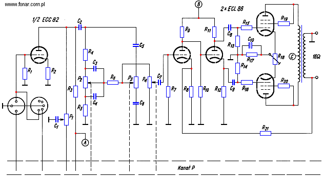 We wzmacniaczu wstępnym zastosowano połówkę triody ECC82. Jest ona przydatna ze względu na duży opór wejściowy, co wpływa dodatnio na działanie regulatora barwy dźwięku. Układ regulatora jest konwencjonalny. Potencjometry 1M (typ SP-3) są sprzężone ze sobą mechanicznie i regulacja barwy dźwięku (również wzmocnienia) odbywa się w obu kanałach równocześnie. Wzmacniacz mocy pracuje w układzie przeciwsobnym w klasie AB. Aby nie komplikować budowy transformatorów wyjściowych zrezygnowano z układu "ultralinear"; nie wprowadziło to większego pogorszenia parametrów. Odwracacz fazy pracuje w układzie wtórnika katodowego. Potencjometr 50omów łączący katody pentod ECL86 służy do wyrównania prądów anodowych w obu lampach. Schemat układu wzmacniacza przedstawiono na rys.1 (obejmuje jeden kanał). Drugi kanał jest identyczny.