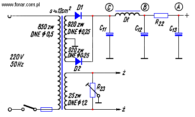 Zasilacz (rys.3) został wykonany w układzie prostownika dwupołówkowego z dwiema diodami DK63. Ze względu na dość duży pobór prądu nie można było zastosować prostowników selenowych w układzie mostkowym, ani nawet dwóch połączonych równolegle. Dławik nawinięto na rdzeniu transformatora głośnikowego o typowych wymiarach (przekrój 3,5÷4 cm2). Uzwojenie nawinięto masowo do zapełnienia korpusu (około 500zw.). Jako lampkę kontrolną zastosowano neonówkę o napięciu pracy 220V włączoną po stronie pierwotnej transformatora. Uzwojenie żarzenia jest symetryzowane opornikiem regulowanym R23.