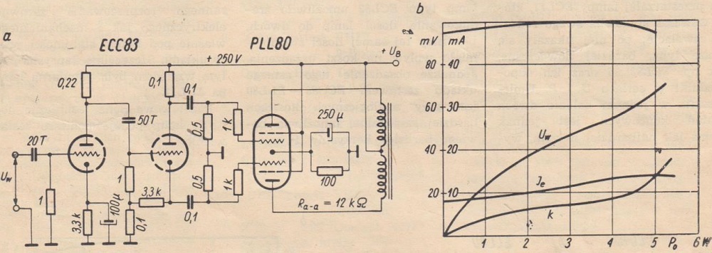 Rys. 4. Schemat ideowy wzmacniacza przeciwsobnego z lampami typu ECC83 i PLL80 oraz jego parametry techniczne
