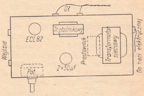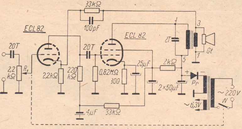 Sygnał wejściowy podawany jest na potencjometr R1 służący do regulacji siły głosu w konwencjonalnym układzie. Z suwaka potencjometru część sygnału przesyłana jest na siatkę sterującą pierwszego stopnia wzmacniacza, w którym pracuje część triodowa lampy ECL82. Z opornika roboczego triody o wartości 220kΩ, wzmocnione napięcia są podawane poprzez kondensator 20000 pF do siatki sterującej lampy stopnia końcowego. W stopniu tym pracuje część pentodowa tej samej lampy ECL82. W obwodzie anodowym stopnia mocy widzimy znany nam już transformator głośnikowy, który niewielką oporność głośnika dopasowuje elektrycznie do znacznie większej oporności wewnętrznej lampy głośnikowej. Jak widać, układ naszego wzmacniacza sieciowego niewiele różni się od poznanego uprzednio dwulampowego wzmacniacza bateryjnego.