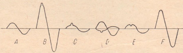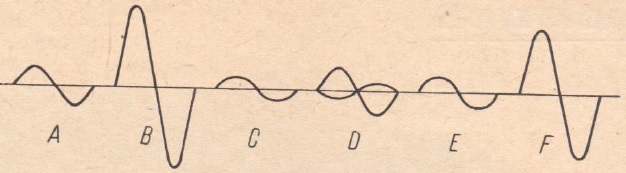 Jak z tego wynika, nie można powiedzieć, że zastosowanie ujemnego sprzężenia zwrotnego przyniosło nam jakąś konkretną korzyść, nie można bowiem twierdzić, aby korzystne było zmniejszenie wzmocnienia układu. Rozpatrzmy jednak obecnie przypadek inny, a mianowicie taki, w którym układ wzmacniacza wnosi zniekształcenia. Pomocny nam będzie w tym rysunek 7. Widzimy na nim sygnał wejściowy A oraz odpowiednio większy sygnał wzmocniony B. Sygnał ten jest zniekształcony, posiada jakiś "wyskok" na wierzchołku krzywej. jest to przykładowe zniekształcenie wprowadzane przez wzmacniacz. Część napięcia wyjściowego tego samego kształtu C doprowadzamy do wejścia wzmacniacza. Obydwa sygnały nałożone na siebie (D) dają wypadkową napięcia E. Jak widać, napięcie to jest zniekształcone (wklęśnięcie na wierzchołku krzywej). Sygnał ten, wzmocniony w układzie wzmacniacza, daje jednak w ostatecznym efekcie napięcie niezniekształcone F. W ten sposób wzmacniacz, wprowadzający normalnie znaczne zniekształcenia sygnału, pracuje dzięki zastosowaniu ujemnego sprzężenia zwrotnego z bardzo niewielkimi zniekształceniami. Nie trudno stwierdzić, że metoda ujemnego sprzężenia zwrotnego polega na celowym zniekształcaniu sygnału wejściowego w taki sposób, aby zniekształcenia te znosiły się ze zniekształceniami wprowadzanymi przez aparaturę.