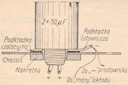 Po mechanicznym umocowaniu wszystkich większych elementów przeprowadzamy montaż elektryczny układu. Obowiązuje jak zwykle poprawne i staranne lutowanie, co pozwoli nam uniknąć wielu kłopotów podczas eksploatacji wzmacniacza. Przewody łączące poszczególne elementy powinny być możliwie krótkie; oporniki i kondensatory małych rozmiarów, biegnące do elektrod lampy lutujemy wprost na podstawce lampowej. Przewód uziemiający wykonujemy z grubego, o średnicy co najmniej 1 mm, drutu miedzianego. Powinien on najkrótszą drogą łączyć jedno z gniazdek wejściowych, skrajny (lewy) biegun potencjometru, metalowy trzpień podstawki lampowej i obudowę elektrolitu. Przewód ten łączymy z podstawą wzmacniacza w jednym punkcie, np. za pomocą śruby mocującej podstawkę lampową i podkładki lutowniczej. Właściwe zamocowanie i podłączenie kondensatora elektrolitycznego jest pokazane na rysunku 10. Przewody żarzenia - skręcone razem - układamy bezpośrednio na blasze "chassis". Inne połączenia, w szczególności przewody w obwodach siatek sterujących, powinny przebiegać z dala od podstawy i innych elementów.