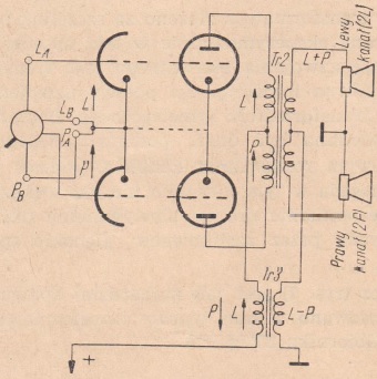 Jak widać, każdy z głośników otrzymuje tylko jeden z sygnałów wejściowych L i P. Zaletą takiego układu jest to, że sygnał L+P, który mieści w sobie największą część energii, zasila głośniki w układzie przeciwsobnym za pomocą transformatora Tr2, natomiast sygnał różnicowy o mniejszej energii, zawierający przeważnie tony wysokie, zasila głośniki poprzez transformator Tr3, który z tego powodu może być mniejszy od transformatora Tr2 i pracować ze składową stałą prądu anodowego lamp końcowych.