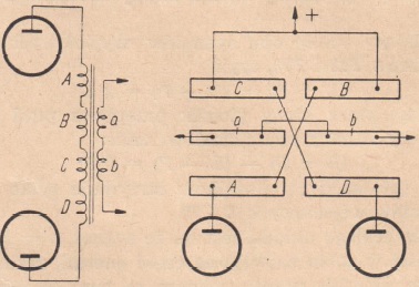 Transformator Tr3 włączony jest swoim uzwojeniem pierwotnym w przewód zasilający obie anody lamp końcowych, wskutek czego działa on na różnicę sygnałów czyli L-P. Wtórne uzwojenie transformatora Tr3 pracuje na oba głośniki połączone równolegle. W rezultacie przy odpowiednio dobranej przekładni transformatora Tr3 przez głośnik górny przepływa prąd odpowiadający sumie obu sygnałów wyjściowych transformatorów Tr2 i Tr3, czyli: