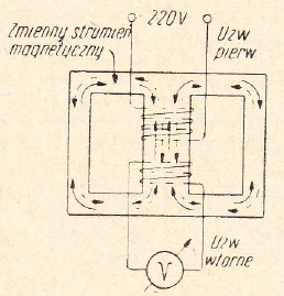 Jeżeli transformator załączymy do źródła prądu zmiennego (rysunek 2), wówczas w jego uzwojeniu pierwotnym popłynie prąd magnesujący rdzeń. Oczywiście indukowany zmiennym prądem strumień magnetyczny jest również zmienny. Ponieważ na tym rdzeniu jest nawinięte także wtórne uzwojenie, zmienny strumień magnetyczny będzie w nim indukował zmienną siłę elektromotoryczną.