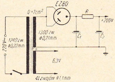 Rys. 3. Schemat ideowy zasilacza z lampą EZ80 i dane uzwojeń transformatora (przykład 1)