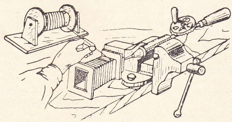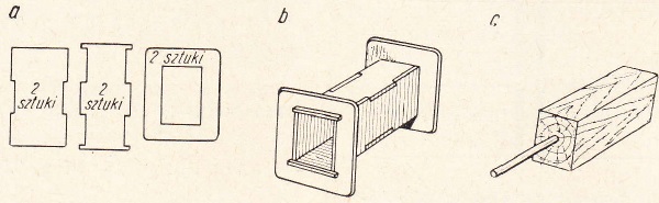 Z kolei, według rysunku 6c przygotowujemy drewniany, dość ściśle dopasowany klocek do wnętrza korpusu. W oś symetrii klocka wbijamy gwóźdź o grubości 2 ÷ 4 mm, a następnie obcinamy jego główkę. Po tych przygotowaniach zestawiamy improwizowaną "nawijarkę", jak to przedstawia rysunek 7. Urządzenie takie w bardzo znacznym stopniu ułatwia nawijanie transformatora, a przede wszystkim stosunkowo równo układa zwoje. Jeżeli nie mamy wiertarki oraz imadła, możemy również nawijać transformator po prostu w ręku, ale jest to w tym przypadku praca uciążliwa i nużąca.