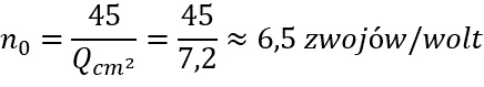 Następnie trzeba obliczyć ilość zwojów przypadającą na jeden wolt napięcia. Ilość tych zwojów, zależną od geometrycznych rozmiarów rdzenia, łatwo obliczyć z następującego wzoru: