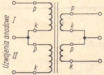 W ten sposób zestawione transformatory łączy się i ściska nową metalową obejmą, a następnie - początek uzwojenia anodowego jednego transformatora łączy się z końcem uzwojenia anodowego transformatora drugiego (rys. 2).