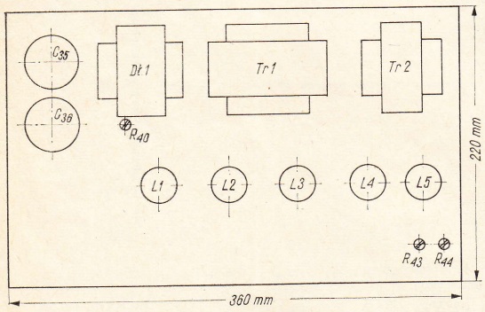 Wzmacniacz montuje się na chassis o rozmiarach 360×220×50mm, wykonanym z blachy aluminiowej o grubości 2mm lub stalowej o grubości 1mm. Na części chassis, zwróconej ku przedniej stronie wzmacniacza, umieszcza się lampy elektronowe, w drugim rzędzie transformatory, dławik i kondensatory elektrolityczne (rys. 2).