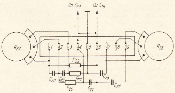 Trzeci i czwarty kanał nie zawierają stopni wzmacniających. Sygnał z magnetofonu lub gramofonu elektrycznego przedostaje się przez kondensatory sprzęgające wprost do regulatorów siły dźwięku R12 i R13.