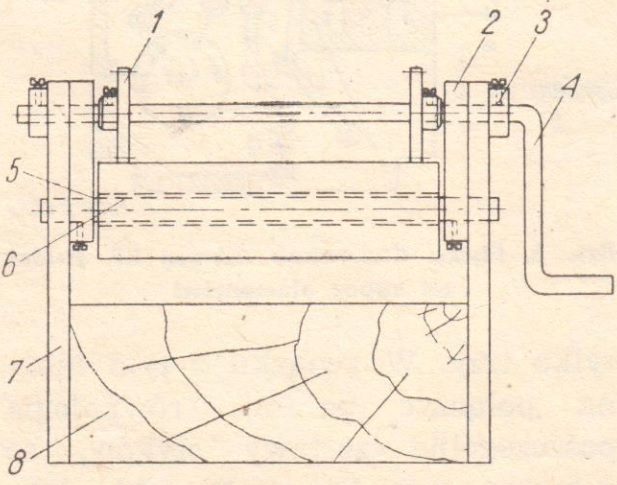 1 - koło zębate (rys. 4); 2 - płaskownik (rys. 3); 3 - pierścień zabezpieczający wałek korbowy przed przesuwaniem; 4 - korba nawijarki (nacinarki); 5 - podkładka dystansowa; 6 - wałek dociskowy (rys. 5); 7 - bok nawijarki (rezoteks lub turbaks); 8 - klocek łączący boki nawijarki (buczyna lub dąb)