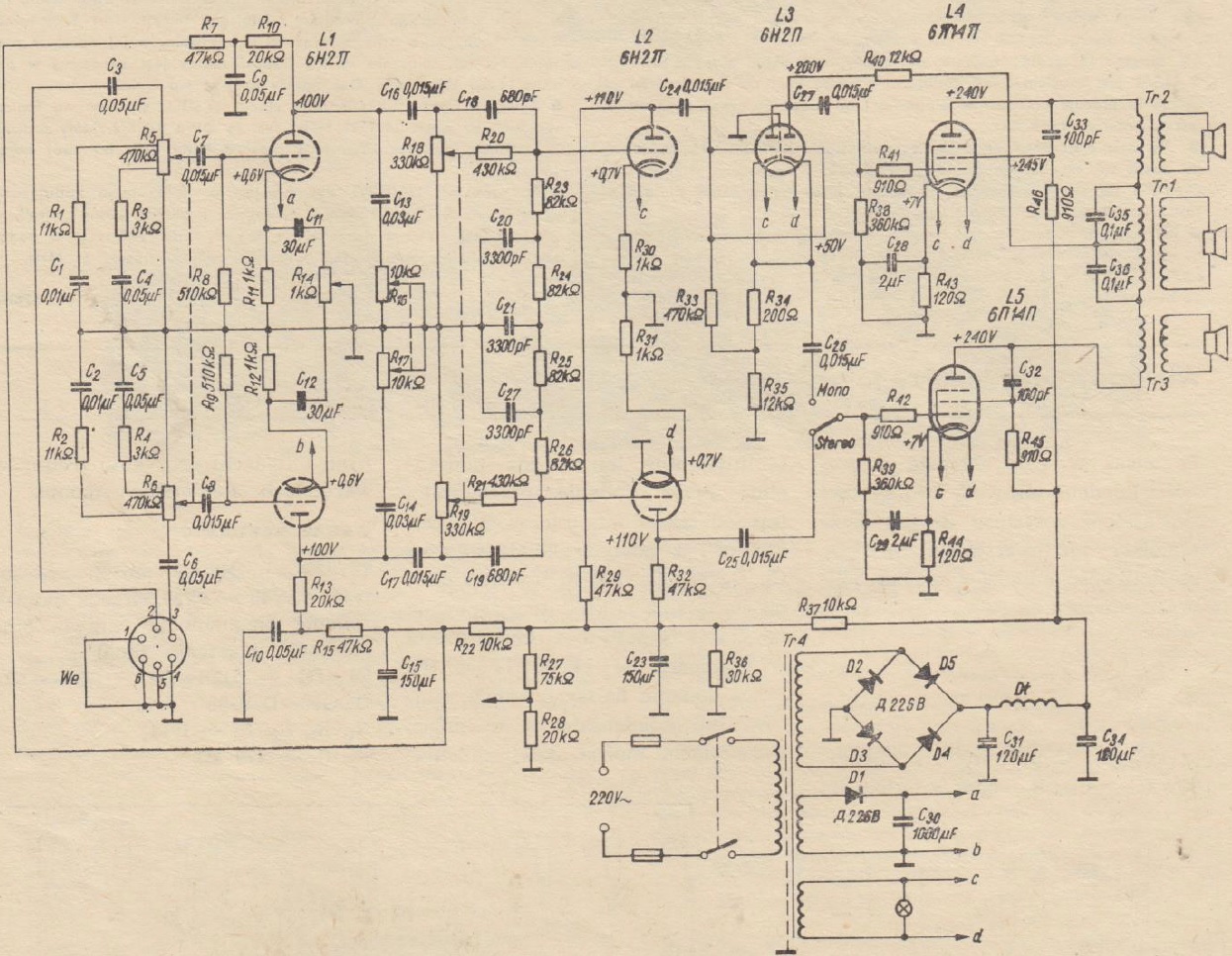 Dwa pierwsze stopnie wzmocnienia z lampami L1 i L2 tworzą dwa identyczne kanały. Regulator wzmocnienia znajduje się na wejściu (R5, R6), a regulatory basów i tonów wysokich - pomiędzy stopniami (R18, R19 oraz R16, R17). Do regulowania równowagi kanałów (balans) służy potencjometr R14. Kondensatory C9 i C10 wpływają na podniesienie tonów najniższych. Ważną rolę odgrywa układ RC składający się z czterech oporników (R23 - R26) i trzech kondensatorów (C20 - C22). Balansuje on oba kanały w odniesieniu do częstotliwości najmniejszych przetwarzanych za pomocą jednego głośnika.