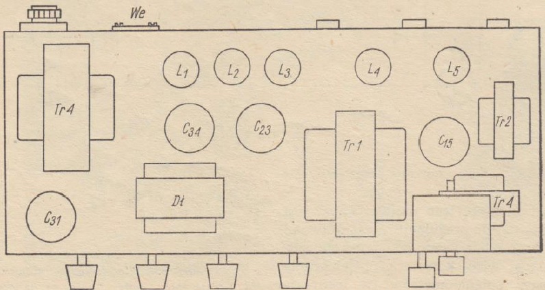 - Tr4 - rdzeń 26×26mm; uzwojenie pierwotne 1084 zwoje drutu ∅0.31mm (napięcie 220V); uzwojenie wtórne 1290 zwojów drutu ∅0.2mm; uzwojenia żarzeniowe po 35 zwojów drutu ∅1.0mm i 0.41mm.