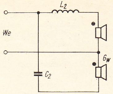 W szereg z głośnikiem wysokotonowym jest włączony kondensator C2, który ogranicza przepustowość obwodu dla częstotliwości małych i średnich o 6dB na oktawę. Jeżeli indukcyjność cewki L2 i pojemność kondensatora C2 zostaną dobrane właściwie, można otrzymać wypadkową charakterystykę częstotliwościową z siodłowym wgłębieniem w zakresie średnich częstotliwości akustycznych. W ten sposób mogą zostać uwypuklone o 12÷18dB basy i soprany. Wpływ elementów filtrujących można osłabić przez równoległe przyłączenie oporników zmiennych (50÷100Ω). Zalecane wartości: