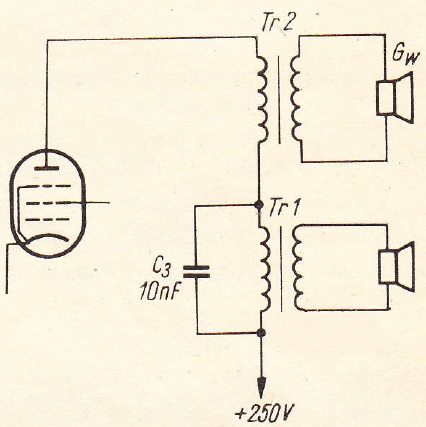 Posiadacze tanich odbiorników lampowych niższej klasy mogą przeprowadzić eksperymenty polepszenia ich brzmienia przez dodanie głośnika wysokotonowego z zastosowaniem osobnego transformatora według układu przedstawionego na rys. 3.