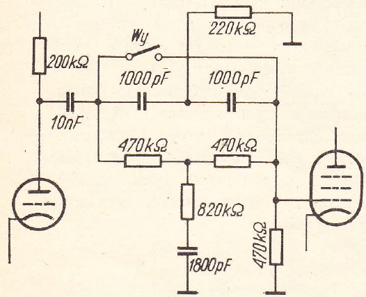 Osłabienie częstotliwości 500÷2000Hz można uzyskać wmontowując do wzmacniacza m.cz. odpowiednie filtry. Jest to sposób najwłaściwszy, ponieważ moce są w tym przypadku znikomo małe i realizacja filtrów nie wymaga wykonania kłopotliwych elementów. Zastosowanie filtrów wymaga jednak dostatecznej znajomości radiotechniki i dokonania pewnych przeróbek w układzie wzmacniacza lub odbiornika. Na rys. 4 przedstawiono układ filtru RC (filtr podwójne T) włączonego między stopień wzmocnienia napięciowego a siatkę lampy głośnikowej. Filtr ten tłumi częstotliwości średnie o około 15dB, to jest napięciowo prawie 6-krotnie. Równolegle przyłączony wyłącznik W4 umożliwia zwarcie filtru, gdy nie zamierza się z niego korzystać. Filtr taki w połączeniu z dość szeroko stosowanym obecnie we wzmacniaczach m.cz. regulatorem basów i sopranów działa nadzwyczaj skutecznie. Jest wówczas możliwe uzyskanie podniesienia (elektrycznie) charakterystyki częstotliwościowej w zakresie basów o 30÷35dB (w odniesieniu do 1000Hz).