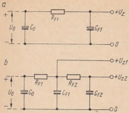 Prąd wyprostowany wydzielać może w oporniku RF1 znaczną moc, co jest niepożądane. Aby temu zaradzić, stosowane są dwa rozwiązania. Jedno z nich przedstawiono na rys. 1b. Polega ono na zastosowaniu filtru dwuogniwowego, z którego pobiera się dwa napięcia zasilające: jedno zaraz za opornikiem RF1 do stopni większej mocy, nie wymagających tak starannego filtrowania, drugie za opornikiem RF2 - do stopni sterujących, radioodbiorczych i innych wymagających idealnego wygładzenia tętnienia.