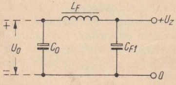 Filtr dwuogniwowy może mieć pewną odmianę, bardzo przydatną w przypadku zasilania nowoczesnych tranzystorowych wzmacniaczy m.cz. Przypuśćmy, że kondensator C0 w prostowniku ma największą dopuszczalną pojemność ze względu na diody prostownicze. Występujące na kondensatorze C0 tętnienie jest jednak zbyt duże. Należy więc zastosować filtr, który będzie miał dostateczne własności filtrujące, lecz bardzo mały opór dla prądu stałego. Należy więc zastosować dużą pojemność CF1, a małą wartość oporu RF1. Drugie ogniwo, przez które zasilane są stopnie wstępne wzmacniacza, może mieć znacznie większy opór dla prądu stałego wobec mniejszej wartości natężenia prądu, stałej jego wartości i możności dopuszczenia nawet dość znacznego spadku napięcia.