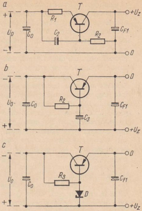 Tranzystory otworzyły nowe możliwości w budowie filtrów - filtry aktywne. Na rys. 3a przedstawiono układ prostego filtru z tranzystorem. Działa on następująco: przez kondensator C2 i opornik R2 płynie prąd zmienny wywołany tętnieniem. Dodatnie jego półokresy zmniejszają ujemny potencjał bazy względem emitera tranzystora T, co jak wiadomo powoduje zwiększenie jego oporu w obwodzie emiter-kolektor. Przeciwnie - ujemne półokresy zmniejszają opór tranzystora w obwodzie emiter-kolektor. Wobec tego spadek napięcia na tranzystorze będzie zmienny i to w taki sposób, że będzie działał wygładzająco na napięcie i prąd za tranzystorem. Znaczny spadek napięcia wynoszący 5÷20V czyni tego rodzaju filtry przydatnymi do zastosowania w zasilaczach wzmacniaczy wstępnych lub wzmacniaczy m.cz. klasy A o niewielkiej mocy (do 8W). Opornik R1 ma wartość 5÷100Ω. Kondensator C2 - 1000÷50μF. Opornik R2 powinien być tak dobrany, aby tranzystor T pracował w zakresie prostoliniowym swej charakterystyki. Zależnie od typu tranzystora wartość tego oporu może wynosić od 500Ω do 100kΩ. Dopuszczalne napięcie kolektor-emiter zastosowanego tranzystora powinno mieć wartość większą od wartości U0 napięcia wyprostowanego, gdyż po włączeniu prostownika kondensator CF1 jest nie naładowany i całe napięcie U0 wystąpi pomiędzy emiterem i kolektorem tranzystora.