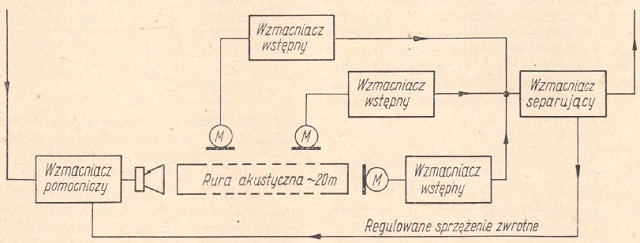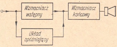 Schemat blokowy uproszczonej aparatury tego rodzaju, pokazany jest na rysunku 24. W kanale opóźniającym widzimy wzmacniacz z głośnikiem, który zasila linię opóźniającą wykonaną w postaci długiej rury plastykowej. U drugiego końca rury zamontowany jest mikrofon, który dobiegające do niego drgania zamienia z powrotem na drgania elektryczne. Długość linii opóźniającej (rury akustycznej) musi być dość znaczna i powinna wynosić nie mniej niż 20m. Rurę taką można odpowiednio zwinąć. W ten sposób, stosując np. dość gruby wąż plastykowy, można sprowadzić wymiary całego urządzenia do wielkości walizki średniego formatu.