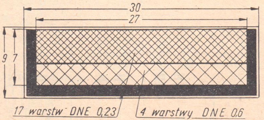 a więc ostatecznie nawiniemy (rys. 3): na spodzie 140 zwojów DNE 0,6mm, a na wierzchu 1640 zwojów DNE 0,23mm. Izolacja z papieru o grubości 0,2mm między uzwojeniami oraz na wierzchu.