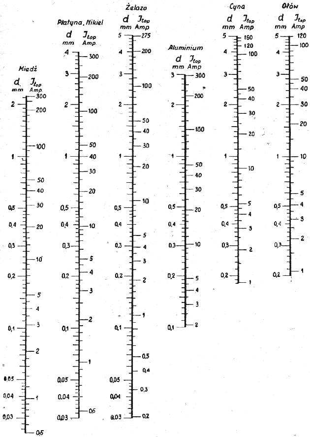 Załączone obok wykresy, pozwalają łatwo znaleźć średnicę drucika dającego bezpiecznik o żądanym prądzie nominalnym. Podkreślamy, że prąd wskazany jest nominalny w uprzednio omówionym sensie, a nie jest to prąd stapiający. Odczyt jest zupełnie oczywisty: obok każdej wartości średnicy, figuruje odpowiedni prąd nominalny i odwrotnie.