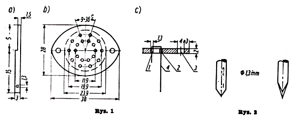 Lampy miniaturowe z uwagi na swe małe wymiary są bardzo przydatne we wszelkiego rodzaju konstrukcjach radioamatorskich. Jak dotychczas – napotyka się niestety na trudności w nabyciu podstawek do tychże lamp. Można je jednak samemu wykonać w bardzo prosty sposób z pertinaksu lub innego materiału izolacyjnego (bakelitu, pleksiglasu, polistyrenu itp.). Dokładne rozmieszczenie otworów kontaktowych uzyskamy, nakłuwając kartkę papieru nóżkami lampy serii Noval. Uwolni to nas od uciążliwego i mało dokładnego odmierzania kąta 36 stopni (rys.1b). Następnie naznaczamy otwory pomocnicze, kontury podstawki, wreszcie środek otworów bocznych (przez które będą przepuszczone śruby lub nity przymocowujące podstawkę do chassis). Powstały w ten sposób szablon wycinamy i naklejamy na materiał, z którego ma być wykonana podstawka. Szydłem lub innym ostrzem naznaczamy środek otworów w podstawce, zdzieramy papier (szablon), nie zapominając oczywiście o uprzednim obrysowaniu konturów podstawki. Następnie wiercimy otwory o średnicach podanych na rys.1c.