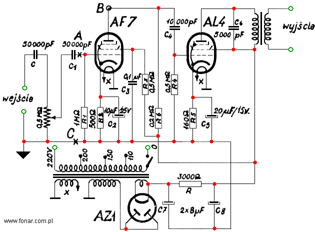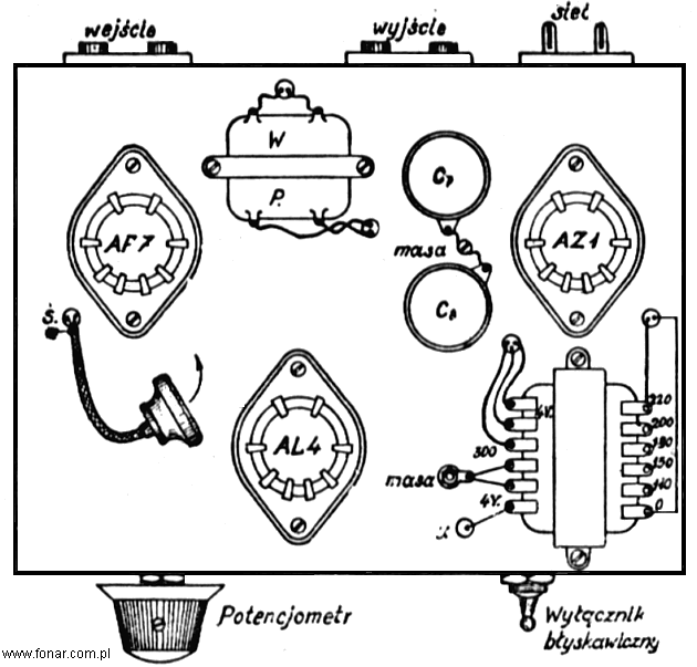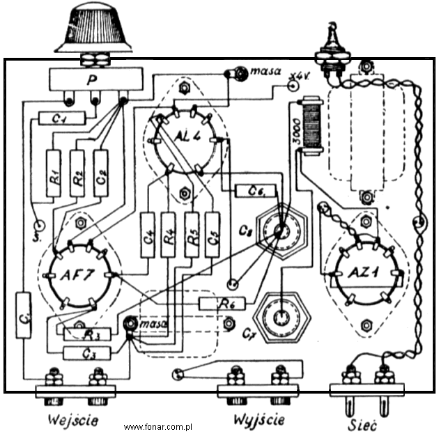 Kondensator „C”, potencjometr „P” i kondensator „C1” sprzęgają źródło napięć akustycznych ze wzmacniaczem, przy czym potencjometr „P” służy jednocześnie do regulacji siły głosu. Z potencjometru napięcia te są następnie przekazywane za pośrednictwem kondensatora „C1” siatce lampy AF7 pierwszego stopnia wzmacniającego, który poprzez elementy sprzężenia „R4” i „C4” steruje lampę AL4, pracującą w stopniu wyjściowym.