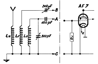 We wzmacniaczu należy w tym celu przerwać połączenie w punktach A i C, aby odłączyć części znajdujące się na schemacie zasadniczym w lewo od tych punktów. Poza tym opór katodowy R2 i kondensator katodowy C2 lampy AF7, która ma pracować jako detektor siatkowy należy zewrzeć, a więc katoda połączona będzie bezpośrednio z masą aparatu, co jest pokazane w części wejściowej wzmacniacza obok części odbiorczej.