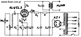 W zasilaczu znajduje się lampa AZ1, która może pracować jako prostownik dwukierunkowy, jednak nie została ona w ten sposób wykorzystana ze względów oszczędnościowych, ponieważ wymagało by to użycia transformatora sieciowego o podwójnym uzwojeniu anodowym. Zastosowano tu mały transformator o przekroju rdzenia 3,5cm2 tzw. jednokierunkowy do jednopołówkowego prostowania w związku z czym obydwie anody lampy prostowniczej są zwarte z sobą. Transformator taki zupełnie wystarcza, bowiem pobór mocy przez wzmacniacz wynosi około 20 watów.