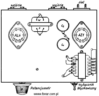 Opory katodowy Rk i anodowy zależą od typu lampy i jej danych katalogowych. W przypadku zastosowania innej niż w opisie pentody głośnikowej trzeba porównań jej dane katalogowe z warunkami pracy lamp AL4 i EL3 i jeśli zajdzie potrzeba zmienić wartość przede wszystkim oporu Rk. Z lamp nadających się do pracy w opisanym wzmacniaczu pod wyżej wymienionym warunkiem można następujące typy: EL11, EC11 bez EB1, ABL1, 6F6, 6V6 itp. Schemat wykorzystywania części triodowej, EL2, montażowy wzmacniacza widzianego z góry i od spodu, ułatwi rozstawienie części, a następnie wykonanie połączeń.