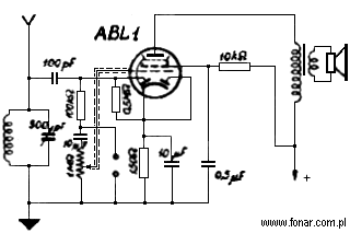 Przy zastosowaniu lamp typu ABL1 lub EB1 (obydwa typy podobnie jak AL4 i EL3, różnią się jedynie napięciem żarzenia, które dla lamp serii A wynosi 4 wolty, a dla lamp serii E - 6,3 wolta), możliwe jest wykorzystanie części diodowej jako detektora zamiast kryształka w aparacie, sterującym wzmacniacza. Układ odbiornika i wzmacniacza da się wówczas znacznie uprościć tworząc całość przedstawioną na rysunku.