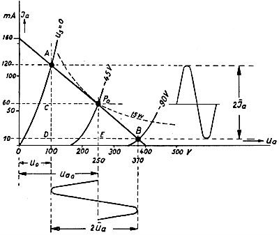 Wiadomo, że jeśli napięcie siatkowe rośnie, czyli staje się mniej ujemne, to rośnie również prąd anodowy lampy i na odwrót. Chcemy oczywiście, aby podczas pełnego wysterowania lampy prąd anodowy był również w pełni wysterowany, to znaczy aby amplituda wahań prądu anodowego, którego wartość spoczynkowa jest równa Iao = 60mA, była równa możliwie tejże wartości spoczynkowej, to znaczy aby Ia = Iao = 60mA. Chcemy więc, aby przy szczytowym napięciu siatkowym Us = 0V szczytowa wartość prądu anodowego dochodziła do wartości Iao + Iao = 2Iao = 120mA. Punkt pracy, który odpowiada tej wartości prądu anodowego przy zerowym napięciu siatki (Us = 0) leży na przecięciu się prostej poziomej poprowadzonej z punktu Ia = 120mA osi prądowej z charakterystyką zerową lampy. Jest to punkt A na rys. 1. Mając już dwa punkty, przez które prosta robocza powinna przechodzić, możemy tę prostą wykreślić. Prowadzimy zatem prostą przez punkty A i Po. Prosta ta jest naszą szukaną prostą roboczą o optymalnym nachyleniu. Przecina ona charakterystykę lampy należącą do napięcia siatkowego Us = -90V w punkcie B. Jest to drugi skrajny punkt pracy lampy. Jeżeli napięcie siatkowe lampy zmienia się od zera do -90V, to punkt pracy lampy przesuwa się wzdłuż prostej roboczej od A do B. Punkty te wyznaczają szczytowe wartości prądu anodowego jak również napięcia anodowego. Przesunięcie się punktu pracy od Po do A odpowiada wzrost prądu anodowego od Iao = 60mA do 120mA i spadek napięcia anodowego od Uao = 250V do ua = 100V. Napięcie ua jest resztkowym napięciem niewykorzystanym. Zależy ono od przebiegu charakterystyki zerowej lampy, ściśle mówiąc od jej nachylenia czyli od oporu wewnętrznego lampy. Ze względu na dobre wykorzystanie lampy napięcie to powinno być możliwie małe. Dobre triody głośnikowe powinny mieć zatem mały opór wewnętrzny.